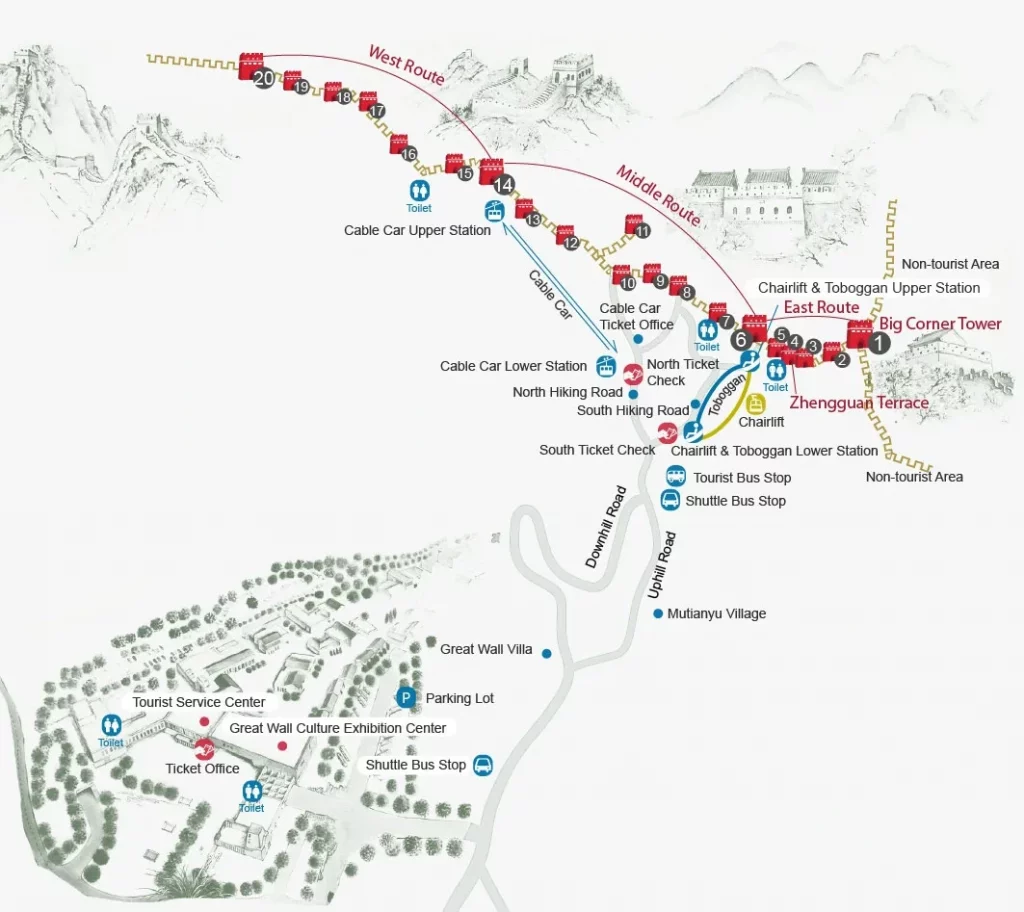 • Badaling: es el tramo más famoso y el más cercano a la ciudad (aprox. 80 km). Está completamente restaurado y muy preparado para el turismo, con accesos amplios y teleférico, pero precisamente por eso es también el más concurrido, sobre todo en fines de semana y temporada alta.