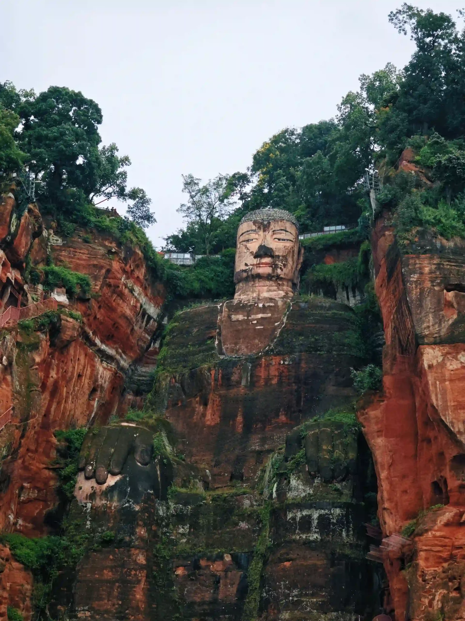 Tienes dos formas de hacer la visita. La primera es el barco por el río: navega hasta colocarse frente al Buda, se queda unos minutos para que hagas fotos (o te las hagan allí mismo, pagando claro) y regresa al muelle, es rápido y te da la vista frontal completa, la más icónica. La segunda es la ruta a pie por el parque, con pasarelas y escaleras que te llevan por encima de la cabeza del Buda y bajan luego hacia los pies, lleva algo de tiempo pero te permite ver detalles de cerca y templos del entorno. Nosotros fuimos al mediodía/tarde, hicimos el tour en barco y volvimos en tren a Chengdu ese mismo día, plan redondo si vas con el tiempo justo.