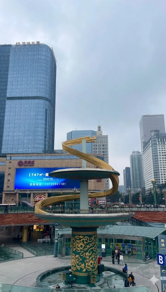 Lo más llamativo es la estatua blanca de Mao Zedong, sobre todo de noche con la iluminación. Debajo está la estación de metro Tianfu Square (Líneas 1 y 2): se accede por un anillo circular en el suelo que baja a un espacio comercial subterráneo. Verás bastante seguridad en la zona.