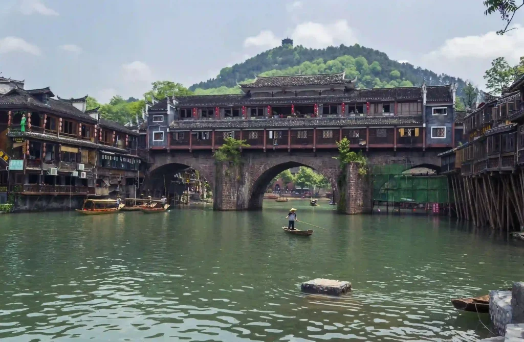 Rainbow Bridge (Hongqiao) es el puente cubierto más emblemático de Fenghuang. Con más de seiscientos años de historia, levantado en época Ming, conecta ambas orillas del río Tuojiang y se ha convertido en el gran icono de la ciudad. Su estructura totalmente cubierta, con madera oscura y detalles tradicionales, lo hace único y muy fotogénico.