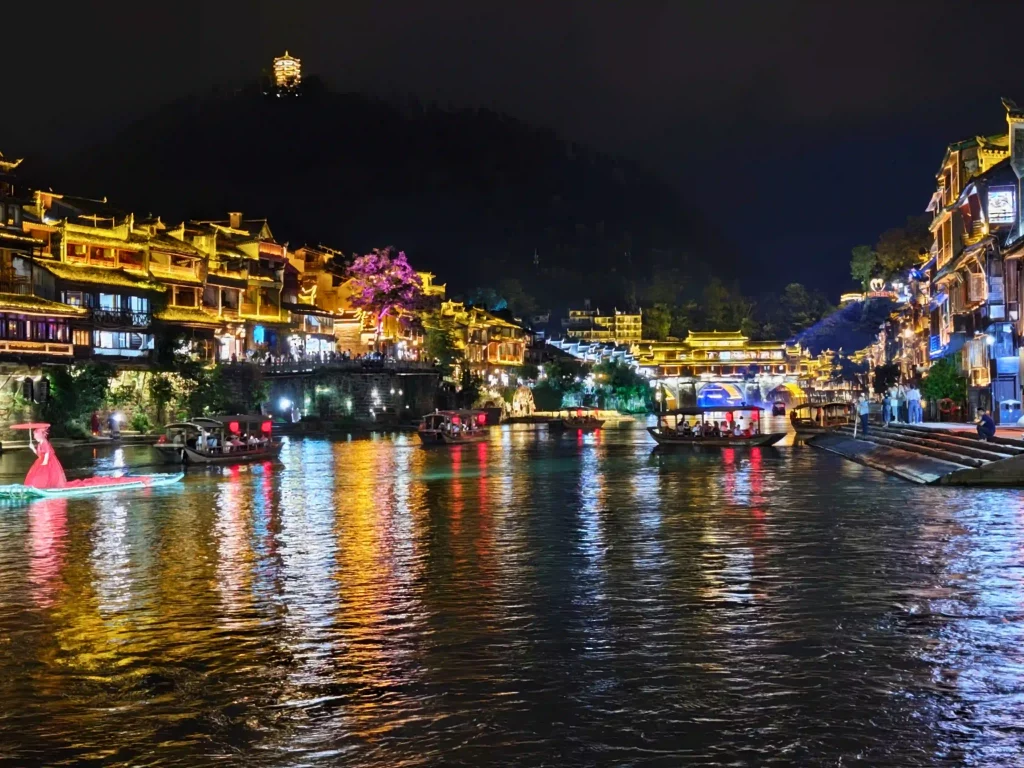 Navegar en una barca tradicional es una de las cosas que hacer en Fenghuang que más merecen la pena. Puedes hacerlo de día o de noche. De día el ambiente es tranquilo y perfecto para apreciar con calma los diaojiaolou y sacar fotos sin prisas. De noche el recorrido se convierte en un espectáculo con efectos de luces, proyecciones, bailes y pequeñas escenas sobre plataformas en el río. Ten en cuenta que el pase nocturno suele ser más caro. Los tickets se compran en el muelle y el trayecto dura unos 20 minutos. El recorrido suele terminar cerca de la pagoda Wanming, desde donde tocará volver caminando.