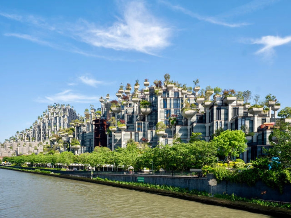Lo más llamativo es su arquitectura: el edificio está formado por cientos de columnas que se convierten en maceteros gigantes, cada uno con sus propios árboles y plantas, creando la sensación de una montaña verde en medio de la ciudad. En total integra más de mil árboles y cientos de miles de plantas, muchas de ellas especies autóctonas del delta del Yangtsé, por lo que se ha convertido en un símbolo de arquitectura sostenible y uno de los iconos modernos de Shanghái.